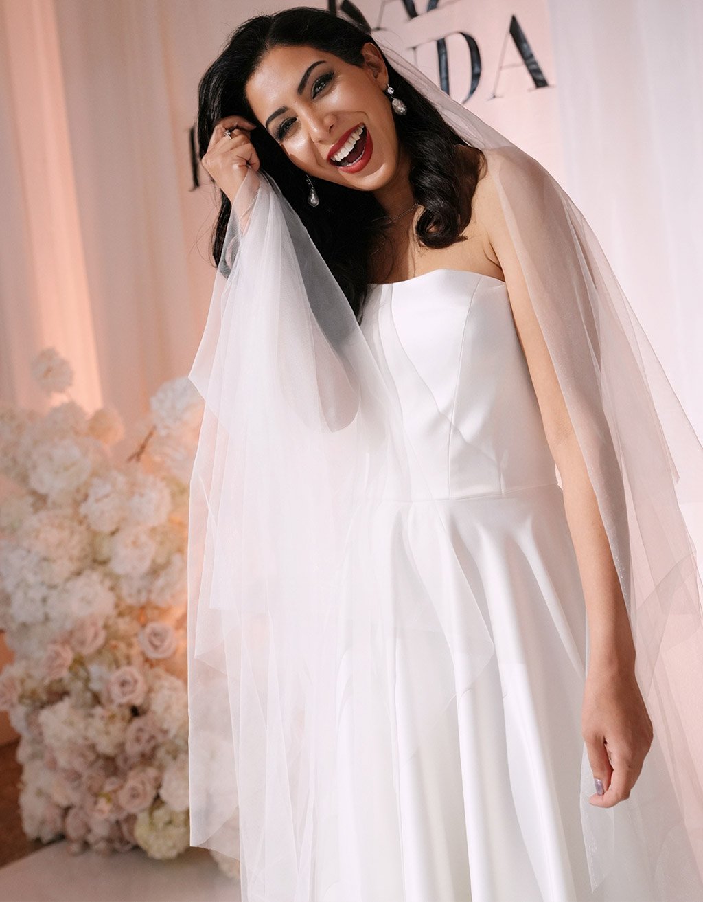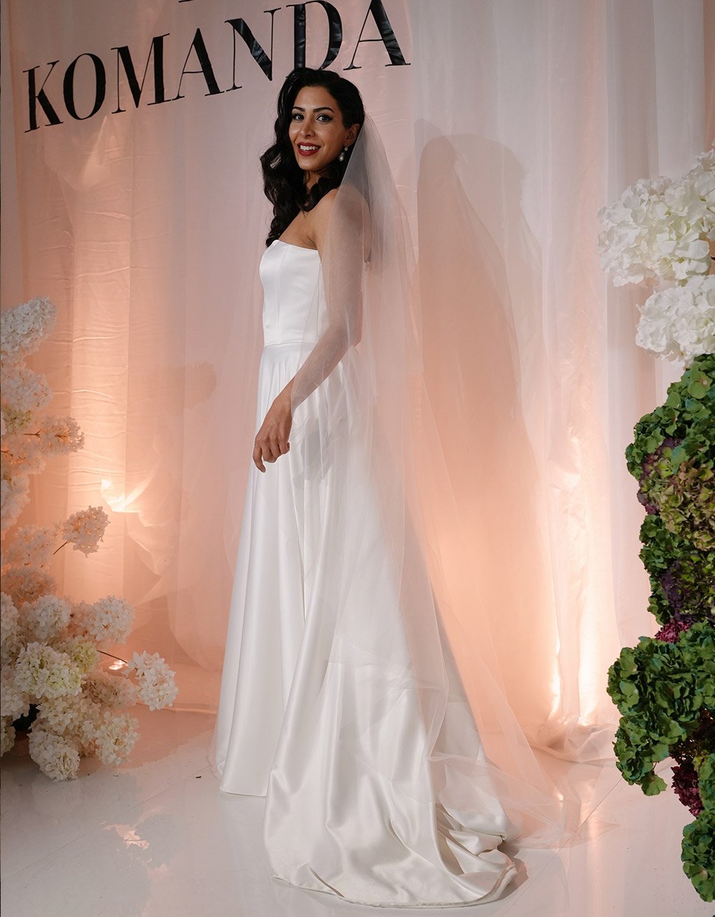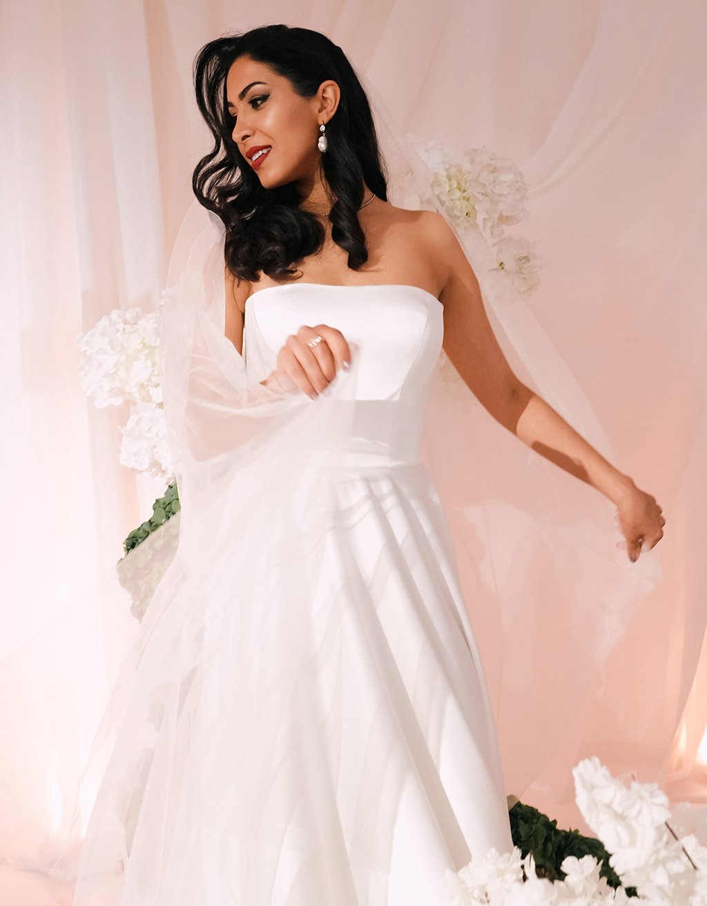 This handmade satin atlas wedding gown features a dramatic sun-cut skirt, hidden side-seam pockets, and an elegant train. Voluminous, refined, and effortlessly beautiful, it is designed for the bride who values both grace and comfort.