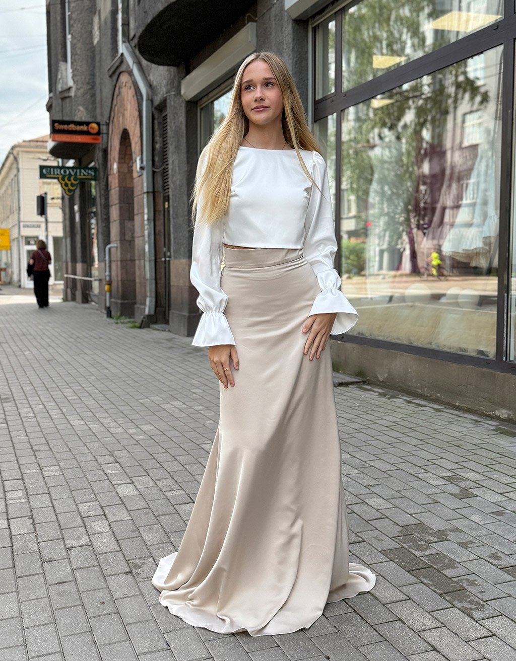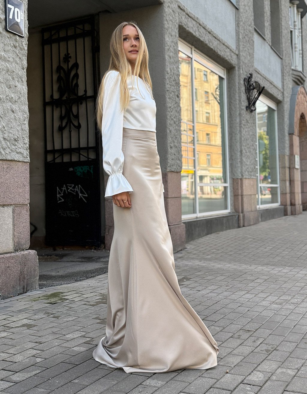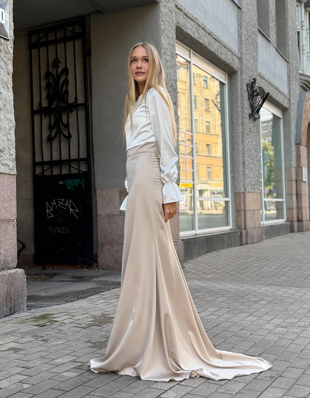 Lined with soft viscose for comfort and structure, the skirt drapes gracefully over the body, creating a flattering silhouette that feels as good as it looks. Whether paired with a sleek blouse or romantic lace top, this skirt is a timeless piece designed for modern brides who value elegance and simplicity.