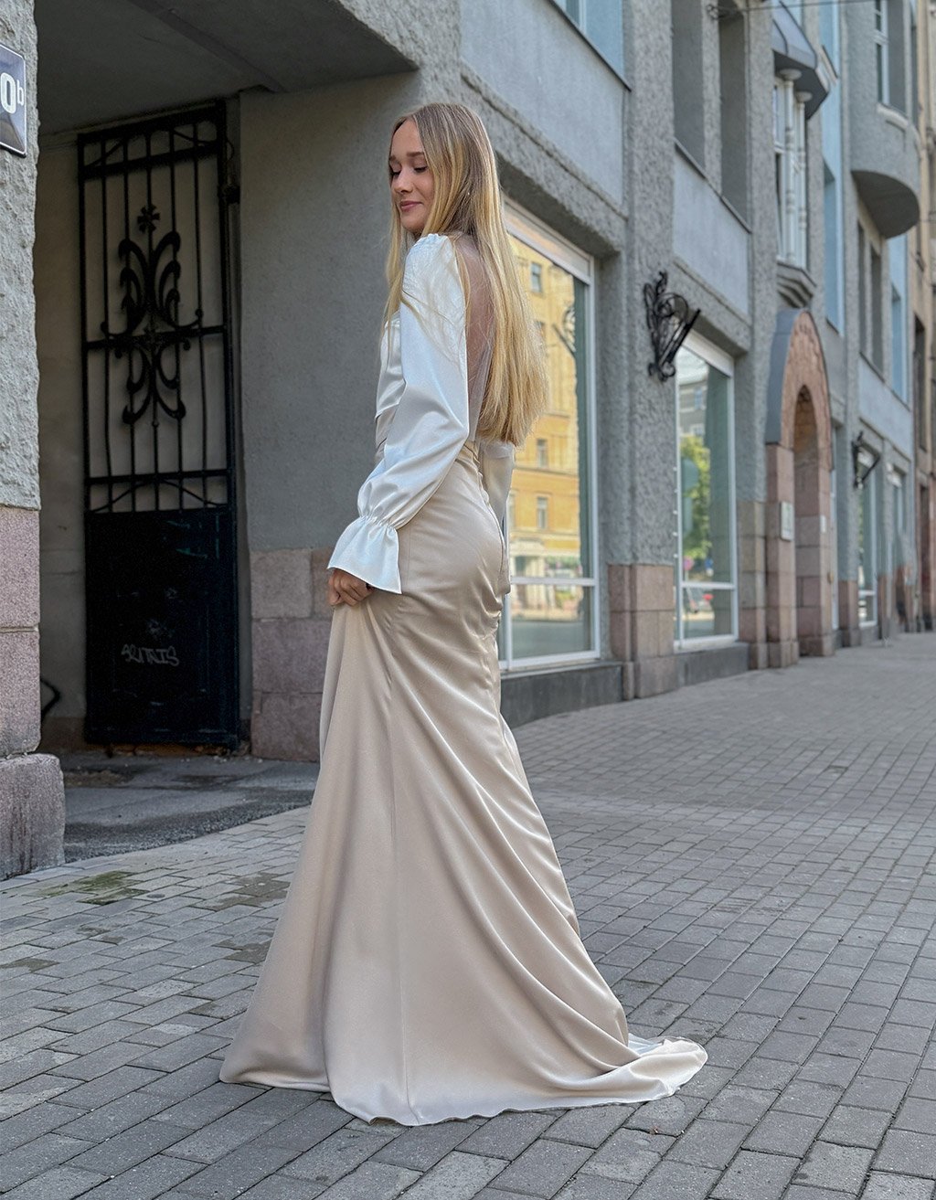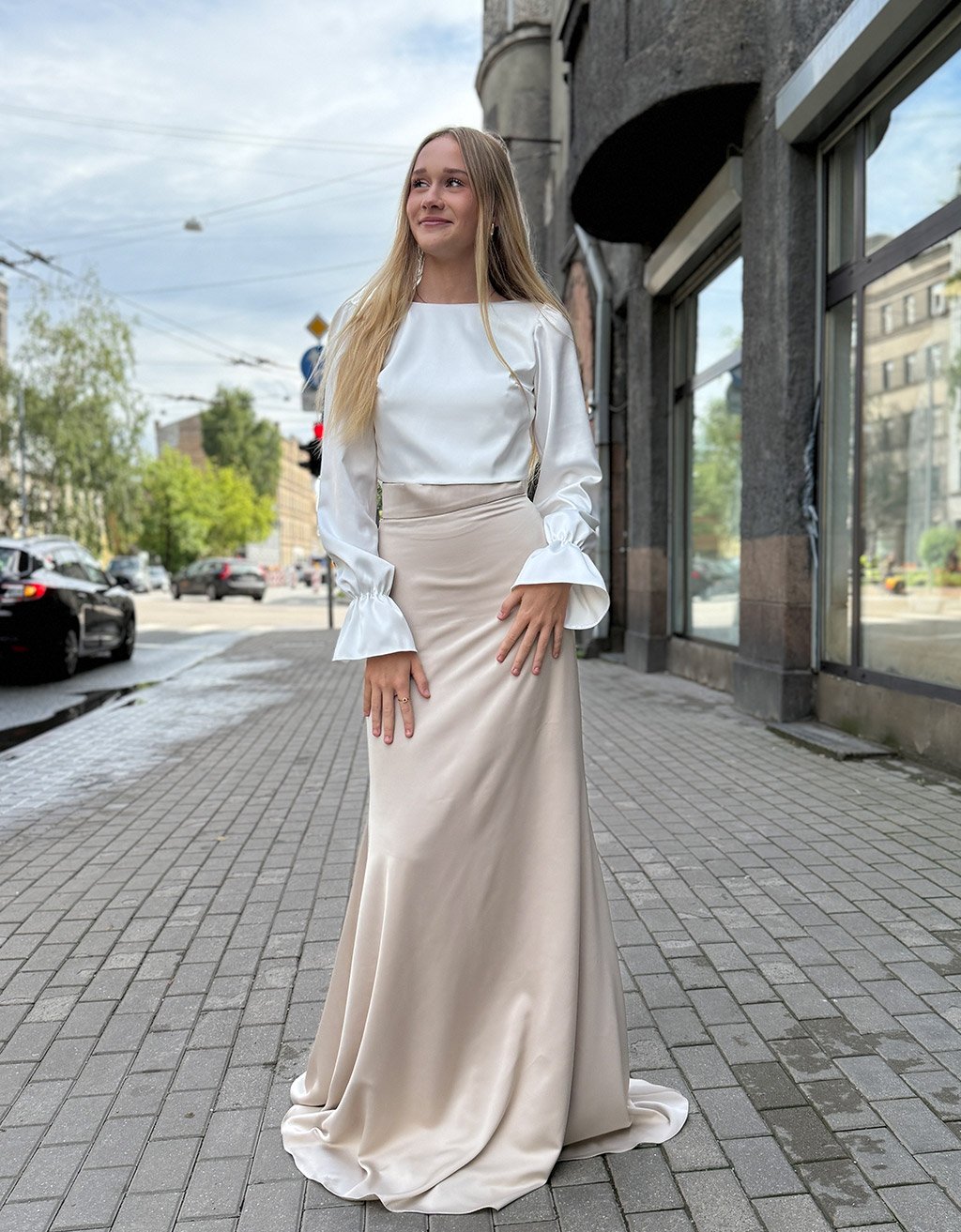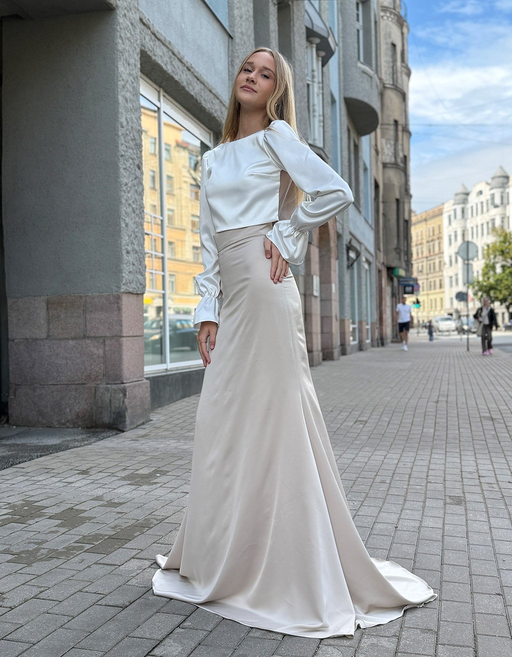 Lined with soft viscose for comfort and structure, the skirt drapes gracefully over the body, creating a flattering silhouette that feels as good as it looks. Whether paired with a sleek blouse or romantic lace top, this skirt is a timeless piece designed for modern brides who value elegance and simplicity.
